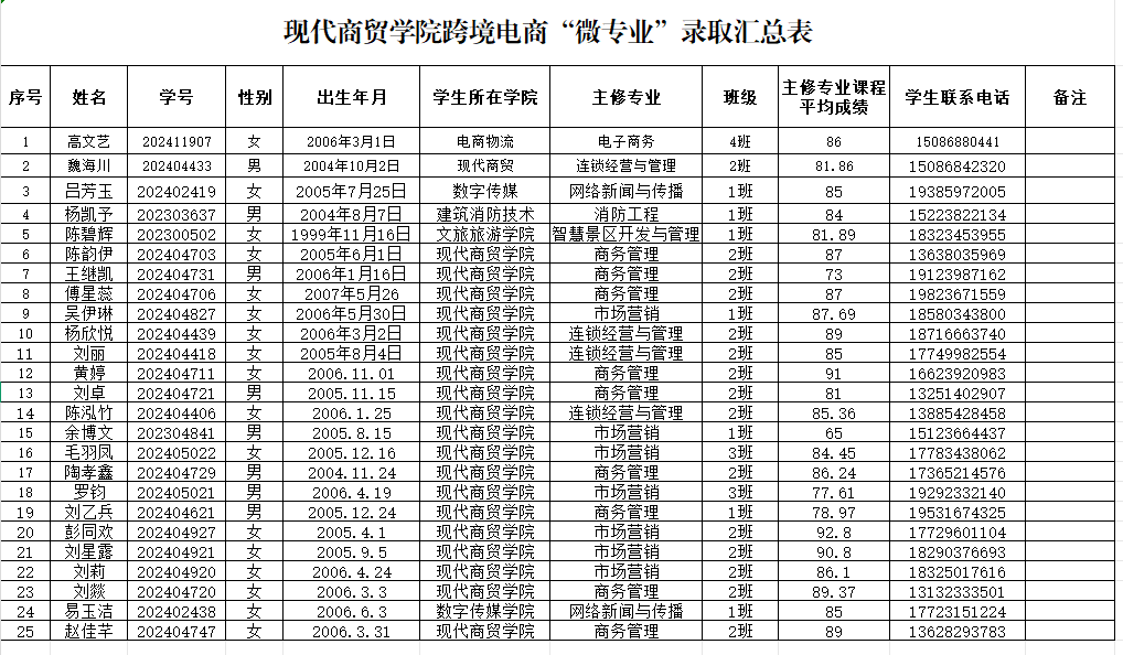 根据《重庆商务职业学院2025-2026 学年微专业实施方案》及相关招生规定,经学生自主报名、院系资格审核,现拟录取25名同学进入跨境电商运营微专业学习,现将录取名单予以公示(详见附件)。