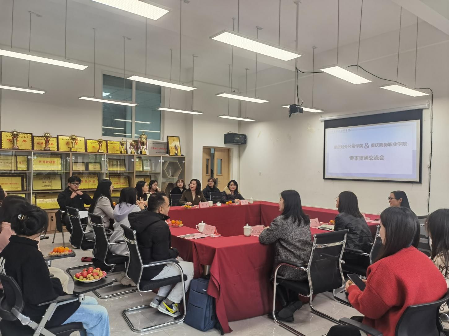 交流座谈会上,重庆对外经贸学院跨境电商学院院长赵逖介绍了学院办学情况以及国际经济与贸易专业的概况。王芳介绍了国贸专本贯通班的办学现状、师资情况以及学生学习情况。桂郭芝子介绍了专业课程设置以及开办的专业活动。双方学生分别分享了自己的专业学习和校园生活,增强了学生间的互动和了解。通过座谈交流,深入了解了跨境电商学院国贸专业人才培养路径,认真听取了本科学校对于国贸专本贯通班学生专业素养和岗位能力的要求。同时,学院双方人员就专本贯通培养方案以及学生的学业职业规划进行了深入的探讨。