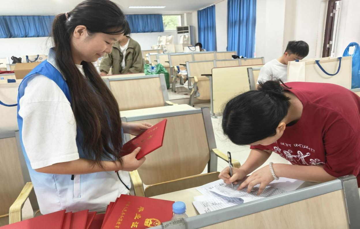 学院定制内涵丰富的毕业礼包,含定制帆布袋、U型枕(实用关怀)、励志书签(精神激励)及《2025就业创业政策指南》《权益保障手册》(价值赋能),附手写祝福卡传递师长期许。学院领导、教师代表亲手为毕业生代表赠送礼包,毕业班辅导员确保441份礼包全覆盖发放给毕业生。礼包既是联结校友情感的实物纽带,更通过政策指南延伸离校后支持链条,彰显学院对学生融入社会、行稳致远的持续关怀。