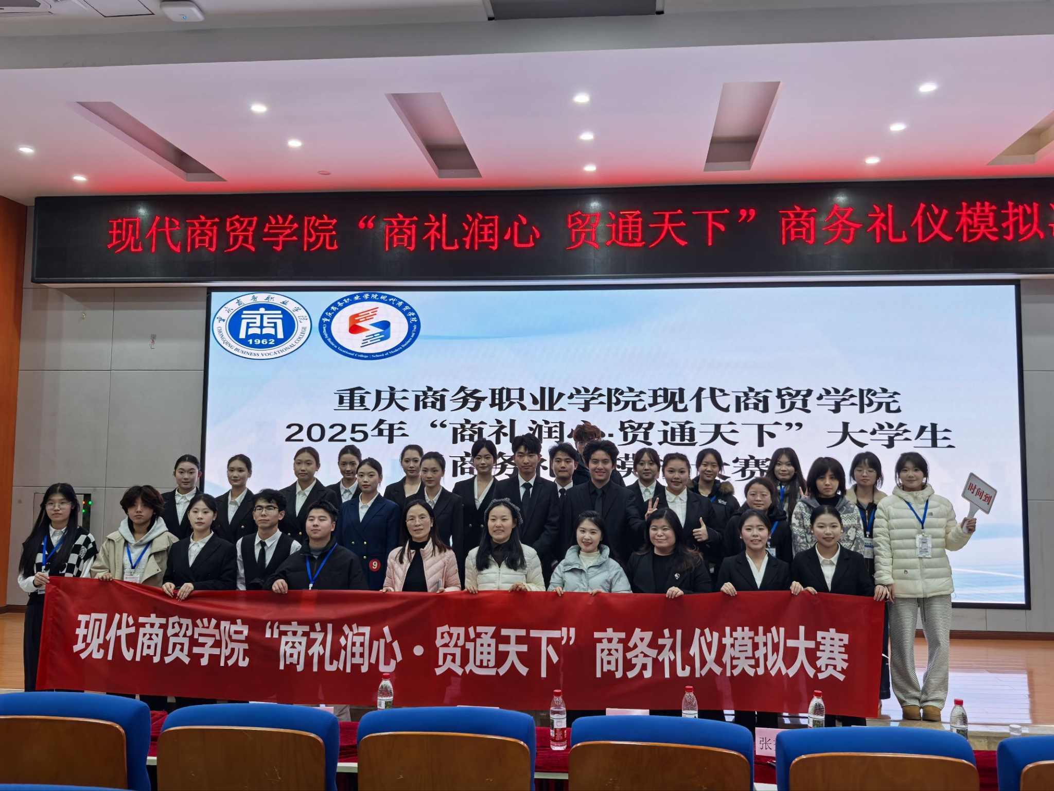 【文/图/谢颖】为强化学生商务礼仪知识储备,提升职场综合素质,展现良好精神面貌,现代商贸学院于2025年12月12日在学术报告厅成功举办“商礼润心·贸通天下”大学生商务礼仪模拟大赛。大赛由学团办公室组织,邀请商务礼仪与沟通课程团队谭嫔、张秀兰、徐潇焱、杜玲等老师及学团办主任谢颖老师担任评委。比赛内容覆盖礼仪知识、综合应变与实操应用等维度,突出“以赛促学、以赛促练”导向,得到各班级积极响应,吸引众多师生到场观摩,现场气氛热烈。