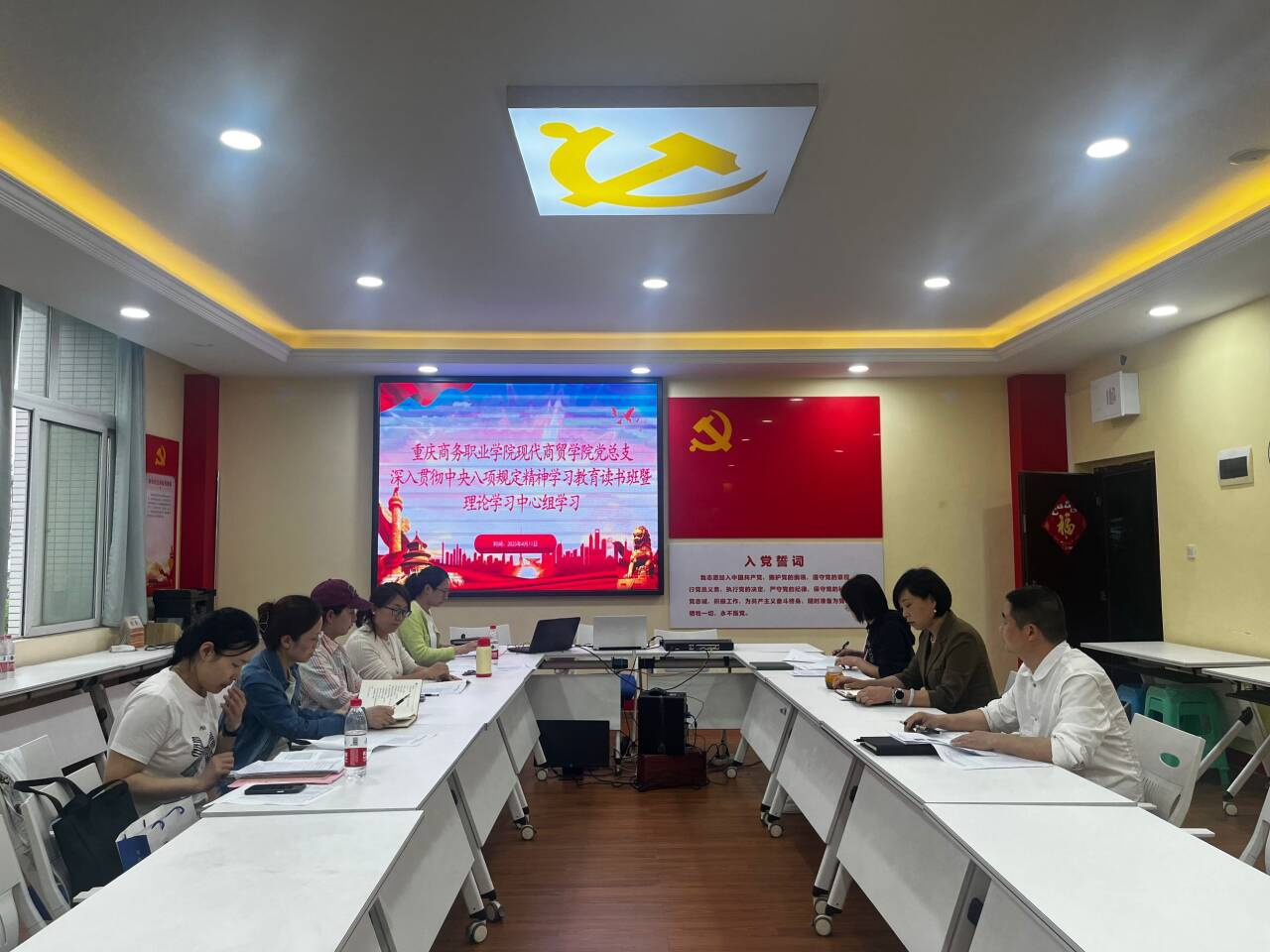 【文/图 高红】4月9日至11日,现代商贸学院党总支举办深入贯彻中央八项规定精神学习教育读书班暨理论学习中心组(扩大)学习教育专题读书班。会议由学院党总支书记、院长李春红主持。学院全体班子成员、支部书记参加学习。