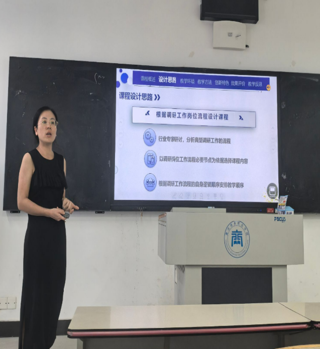 谭娅同志讲《市场调查与分析》课程聚焦学生市场洞察力的培养,依托贯穿学期的真实调研项目组织教学,引导学生完整掌握从调查设计到报告撰写的全流程,考核评价与项目进程紧密挂钩,多维度评价。她紧密结合学科核心素养要求,明确知识目标、能力目标与情感态度价值观目标的有机统一,并着重介绍了如何在教学过程中融入爱国主义教育、科学精神培养等思政元素,体现了“立德树人”的根本任务。