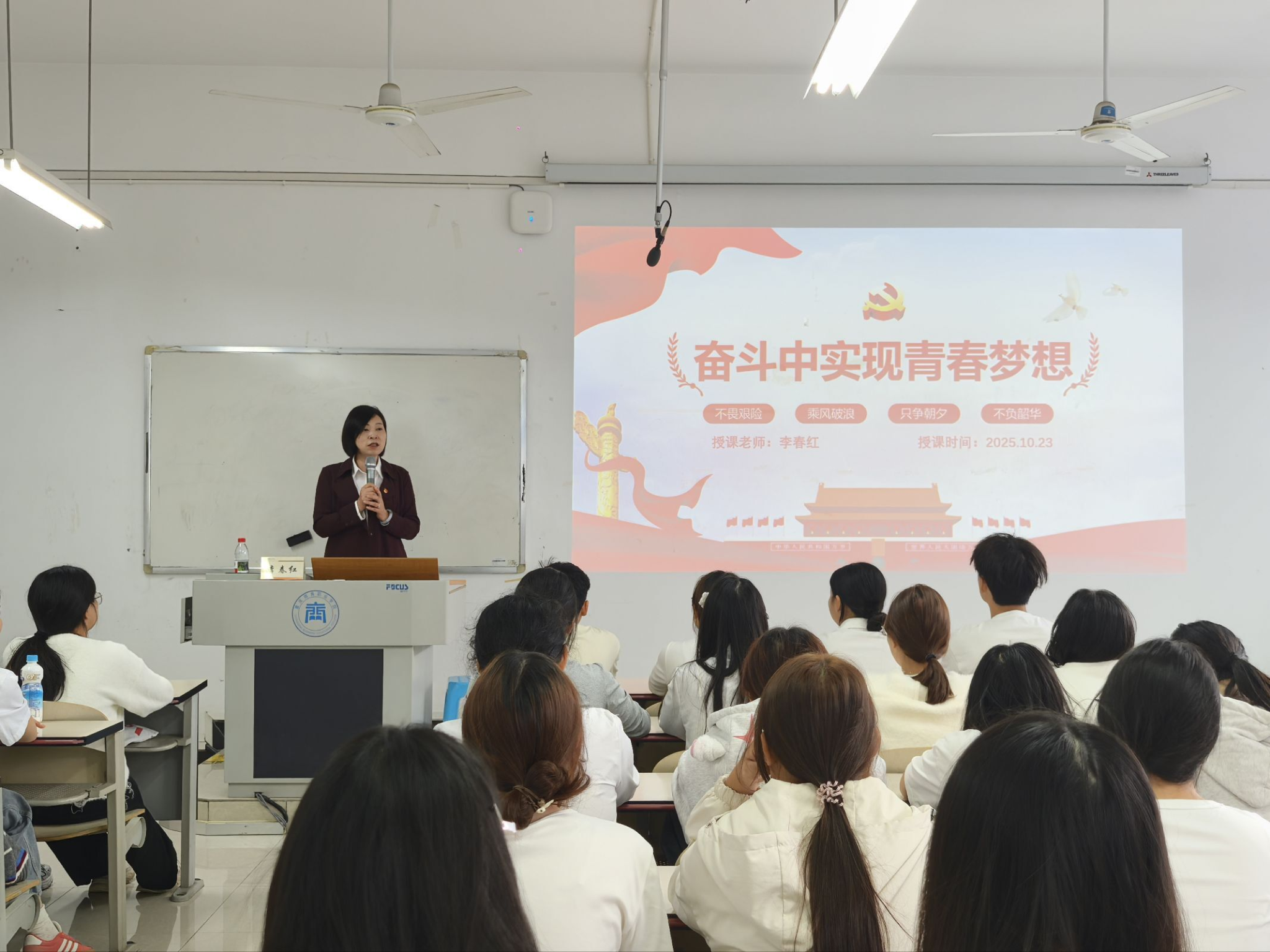 【文/图 高红】为引导青年学员将个人理想融入时代洪流,筑牢信仰之基,10月23日,学院在1322开展《奋斗中实现青春梦想》专题党课学习。现代商贸学院党总支书记、院长李春红主讲。全体第二期青马班学员参加。