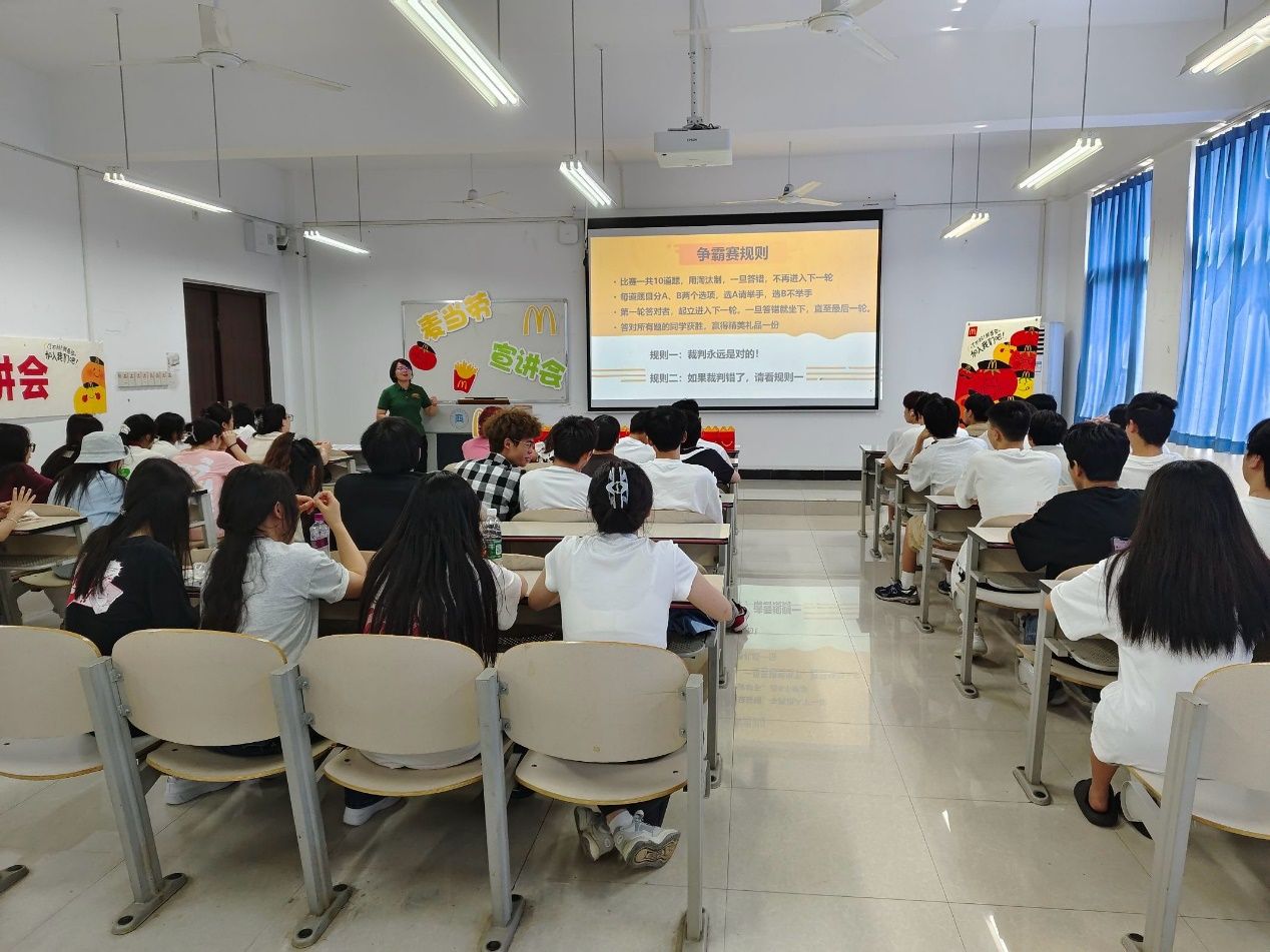 【文/图 蒋杨】为深入开展校企合作,引进优秀企业文化,帮助2022级学生充分做好顶岗实习与就业的准备,实现由“学生”到“员工”身份的顺利转换。6月13日,经济贸易学院邀请麦当劳(中国)有限公司重庆分公司在1322开展了就业宣讲会。