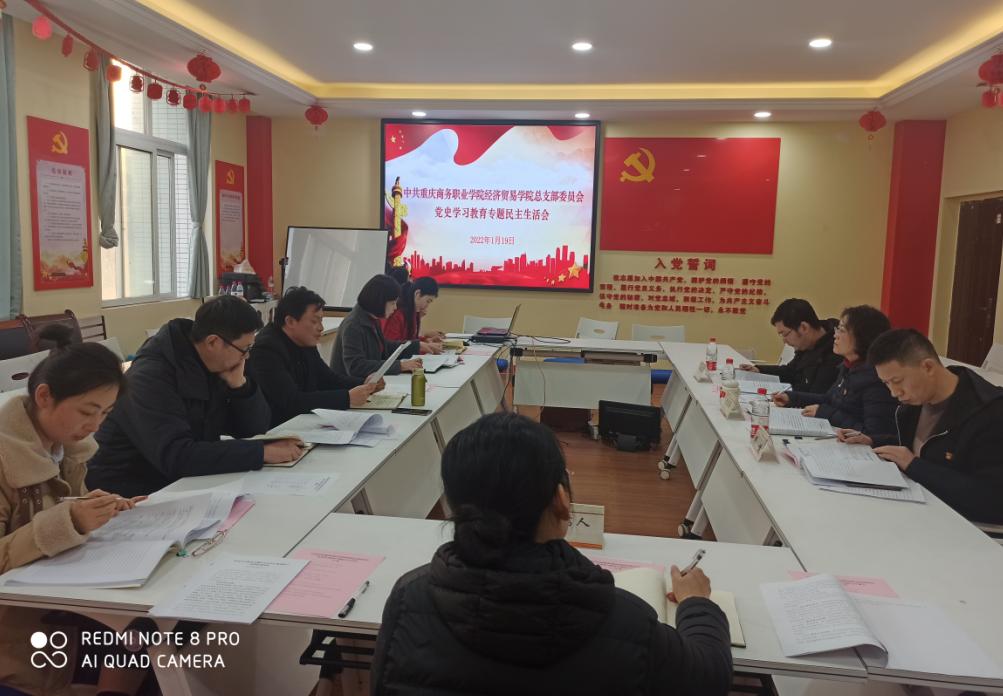 【文/贺睿 图/周双燕】根据学校党委相关要求和部署,1月19日下午,经济贸易学院在学院党建工作室召开2021年党史学习教育专题民主生活会。学校党史学习教育专题民主生活会专项指导组第十组组长李蓓英、副组长邓健带队到会指导,会议由学院党总支书记李春红主持,党总支班子全体成员参加会议,党总支下设党支部书记列席会议。