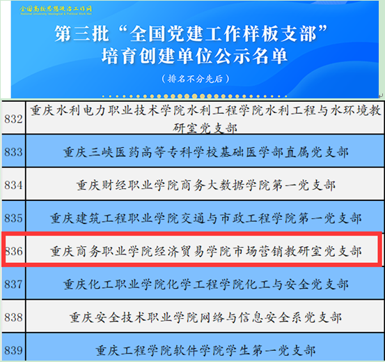 【文/图 市场营销教研室党支部】近日,教育部思政司对第三批新时代高校党建示范创建和质量创优工作遴选结果进行了公示,遴选产生了11个全国党建工作示范高校、100个全国党建工作标杆院系、1000个全国党建工作样板支部。