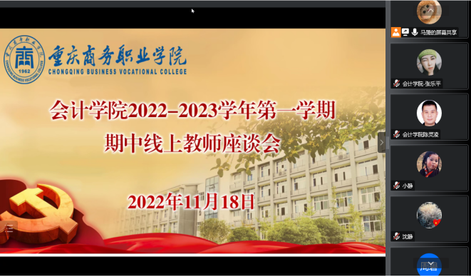 2022年11月18日下午3点40分,为提升会计学院教学质量,了解教师在教学方面的问题,会计学院利用腾讯会议召开了教师座谈会,院长沈静、党总支副书记陈灵凌学院教务办和全体教师参加了此次会议。