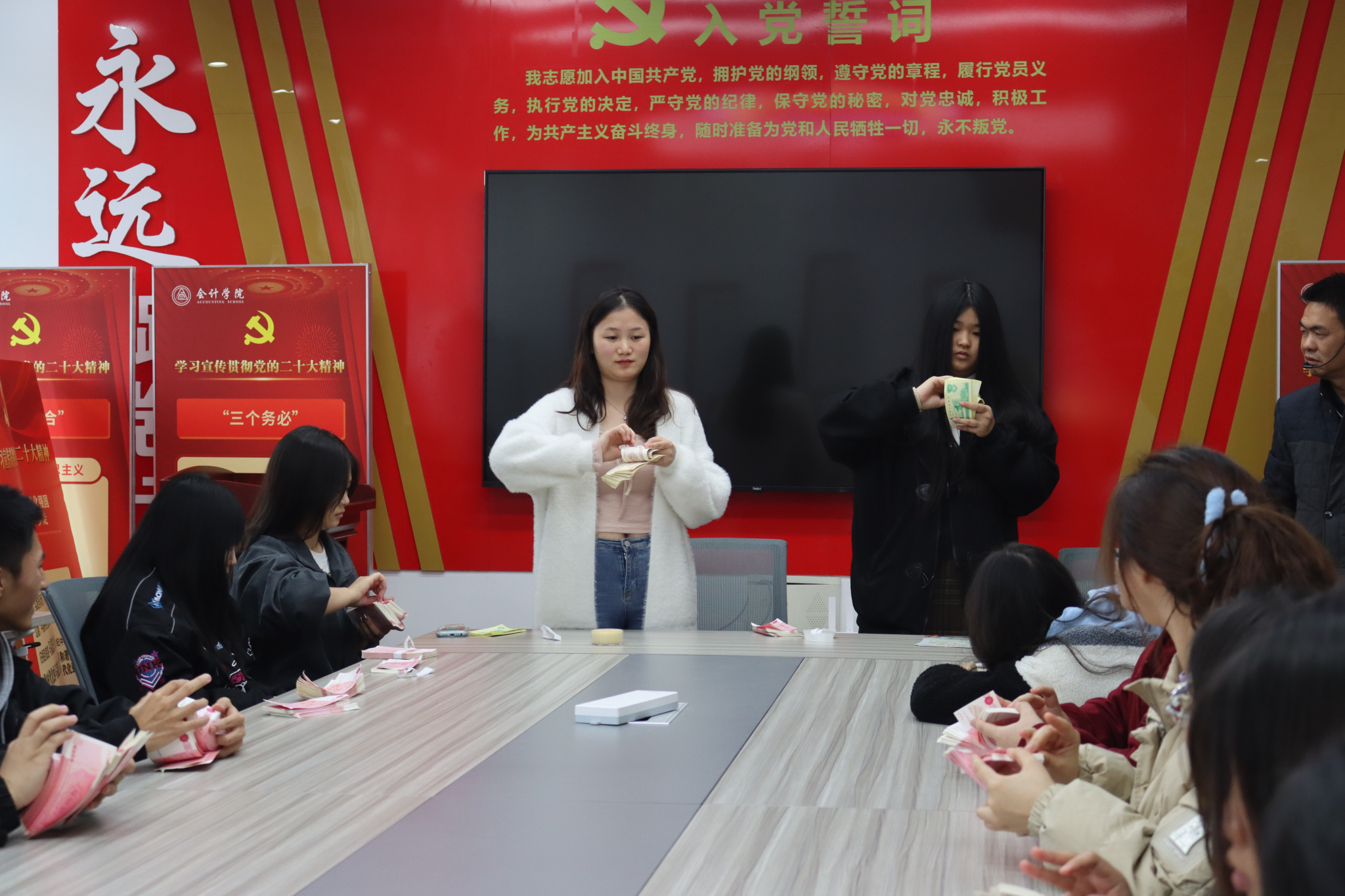 伴随着清脆的点钞声,同学们的技术逐渐熟练起来。唐老师勉励现场同学,要通过实践操作来检验理论学习,只有把书本上学到的理论知识应用于实际的会计实务操作中去,才能真正掌握这门知识。