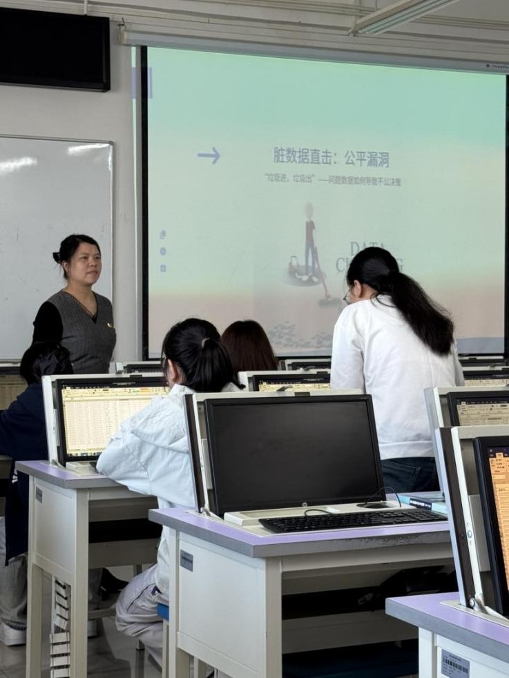 本次公开课围绕数据处理的核心环节——数据清洗,以“为数据‘沐浴’,为诚信‘代言’”为主题展开教学。唐老师首先系统讲解了数据重复、异常值与缺失值、格式不统一等数据清洗的常见问题,然后再进行案例式教学,引导学生构建从“发现问题”到“解决问题”的完整知识框架。在教学方法上,采用“理论引领、案例驱动、实操巩固”的教学闭环,通过PPT系统讲解、选取贴近学生生活的校园卡消费记录进行案例分析,以及借助Excel软件实时操作,实现了“学中做、做中学”的教学目标,课堂氛围活跃,学生参与度高。