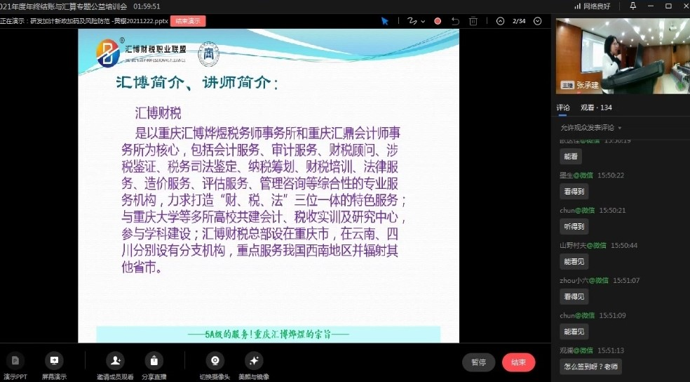 重庆汇博烨煜税务师事务所所长张承建从财务年终结账和企业所得税汇算两个方面,就风险点控制、实务处理等做了深入的讲解,并就相关问题做了现场答疑。