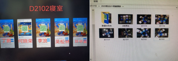 该方法是以寝室为单位,通过室长集中收取寝室成员当天健康码照片,以手机摆拍并署名的方式,将寝室号、学生姓名和健康码状况进行打包合并存放,将以往一个班级四、五十张截图图片精简为4-5张,较大地提升了数据报送和储存效率,便于辅导员一目了然,简洁高效地开展数据采集工作。(图/文:徐鹏,审核:陈灵凌)