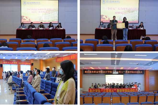 为学习贯彻习近平总书记在全国教育大会、全国高校思想政治工作会议以及学校思想政治理论课教师座谈会上的重要讲话精神,扎实推进改革攻坚,落实《教育部“三全育人”综合改革试点工作建设要求和管理办法》及重庆商务职业学院“三全育人”综合改革要求,2022年4月20日,会计学院“三全育人”典型学院启动仪式在第二教学楼学术报告厅隆重举行。重庆商务职业学院学生工作部副部长徐鸥、会计学院院长沈静、会计学院党总支副书记陈灵凌、综合办公室主任周碧、教务办公室主任马箫、学团办公室主任邢全超和会计学院共计50名师生代表出席此次会议。