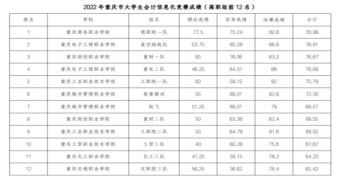 2022年11月19日,经过线上的激烈角逐,在市教委主办的重庆市大学生会计信息化竞赛中,由罗玦、韩芳艳老师指导,重商会计学院学子何佳杰、周光莉、黎文莉组成的参赛团队,在全市高职院校37支队伍中,以团体第一名的成绩获得该赛项一等奖。这份成绩的获得充分展现了备赛学生积极向上的精神面貌,是重商积极推进“以赛促教、以赛促学、以赛促改、以赛促建”的结果。