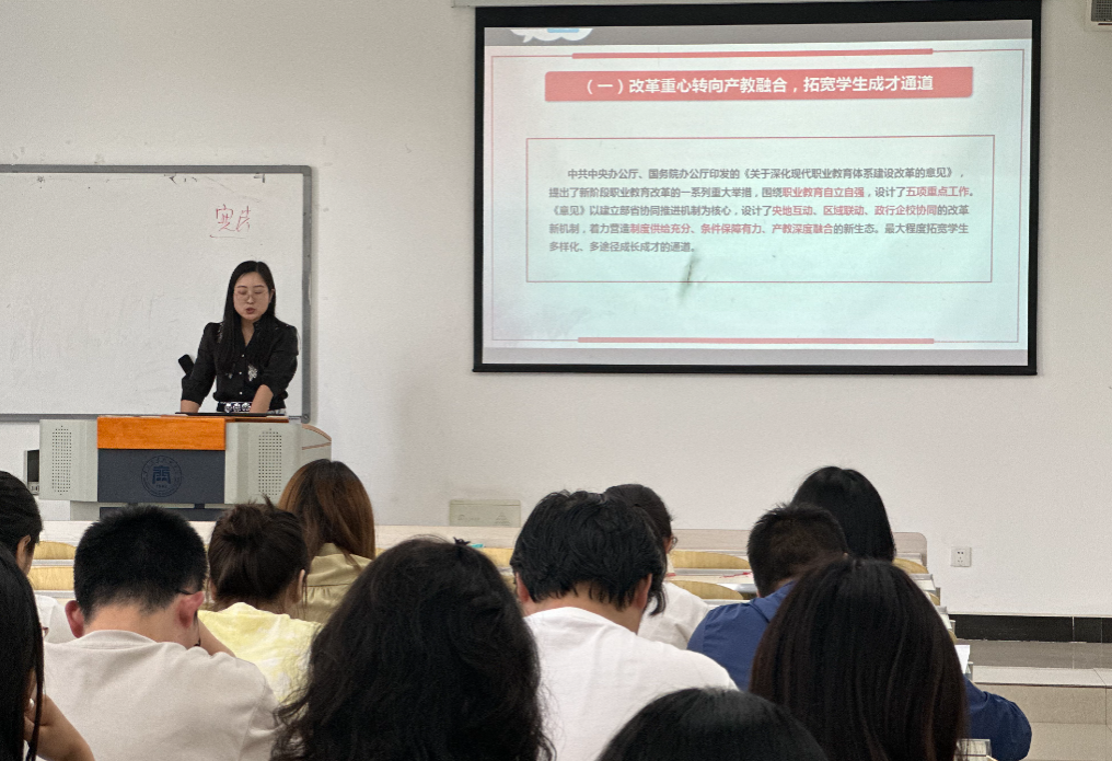 邓亚昊通过对2023职业教育十大热点进行解读,围绕十大重点内容探索学院工作方向,强调夯实基础、提升办学能力、团队打造的重要性,围绕“一体两翼五重点”职业教育体系精神,对学院教学工作进行强调,下一步学院将重点打造国际化职业标准和国际化课程。围绕科研经费报账问题、课题参研和结项注意事项等问题做强调。她希望老师们继续上好每一堂课、坚守自己的主战场,怀着科教兴国、科教兴校的信心,为发展好职业教育,努力造就高素质技能人才做出成绩。