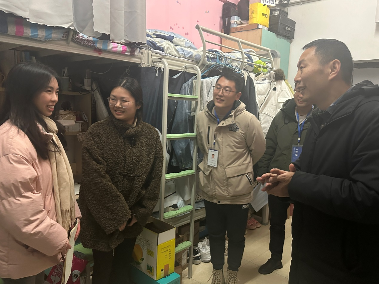 在走访过程中,学院领导亲切问候学生,重点围绕安全、清洁卫生、学习、生活、就业等多方面问题与同学们展开交流。在安全问题方面,近期气温较低,流感多发,学院领导嘱咐同学们注意保暖,同时,在宿舍里要加强宿舍清洁管理,保持宿舍环境卫生,注意安全用电,做到“人走断电”,严禁使用违禁电器;在矛盾纠纷排查方面,开展与少数民族学生、心理问题学生、家庭经济困难学生谈心谈话,了解同学们目前在学习、生活中遇到的难题,提醒同学们要劳逸结合,关注身体健康与心理健康,做到心理问题排查、疏导及化解;在思想提升方面,结合近期通报的电信网络诈骗案例、学生在校外打麻将引发的次生矛盾和网上发表不当言论等案例,对学生加强国家安全、政治安全和校园安全宣传教育和引导,全面提高学生安全防范意识。