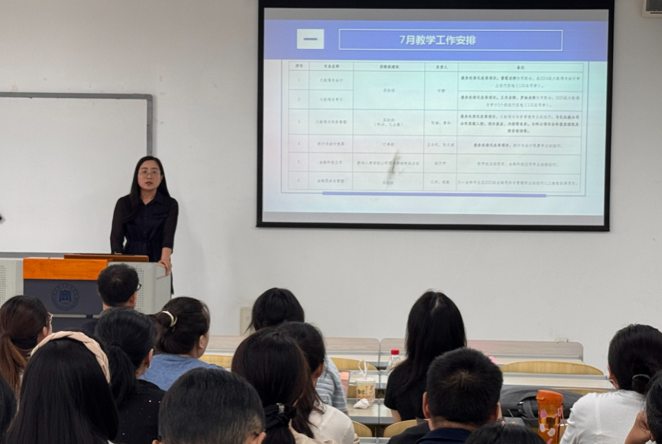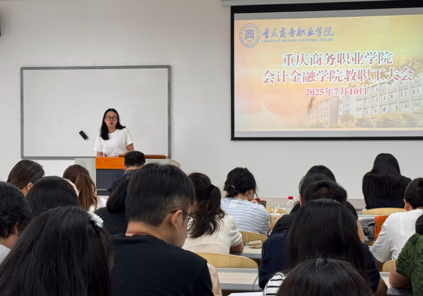 2025年7月10日,会计金融学院在2303召开2024-2025学年第二学期末教职工大会。会议由教学教务办主任周碧主持,学院党总支书记、院长冉启江、党总支副书记徐正义、副院长邓亚昊及全体教职员工参会。