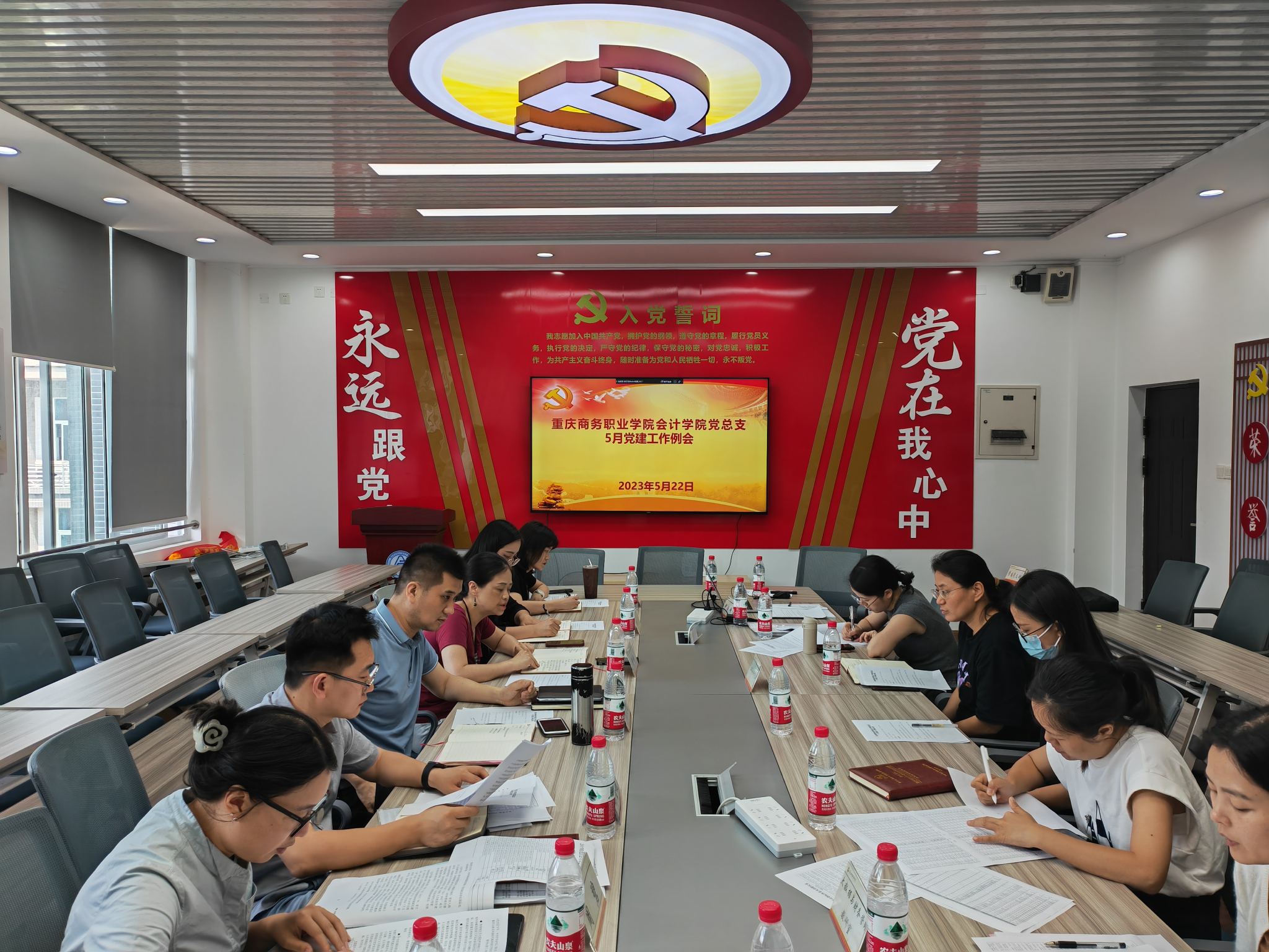 根据第一议题要求,会上首先学习了习近平总书记最新重要讲话重要批示精神。学习了习近平总书记在新时代推动西部大开发座谈会和视察重庆时的重要讲话重要指示精神,学习了中共重庆商务职业学院委员会2024年党建工作要点和《关于转化对接市委“八张报表”的通知》文件精神,解读了新修订的《中共共产党纪律处分条例》,传达了学校5月份党建工作例会会议精神,院领导安排部署相关工作。