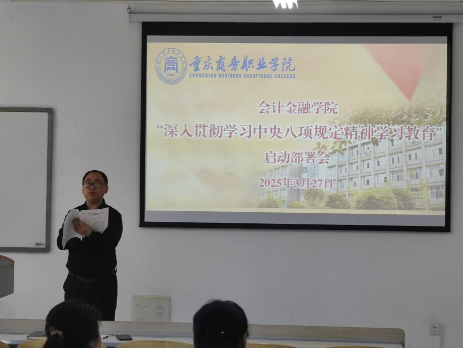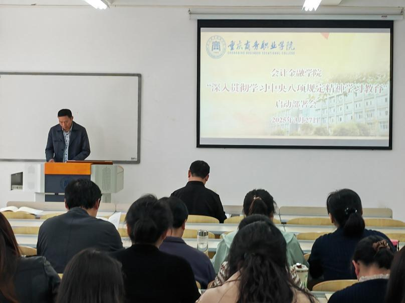 【文/图 尹晓峰】 3月27日,会计金融学院党总支在2320召开深入贯彻中央八项规定精神学习教育动员部署会,党总支书记、院长冉启江作动员讲话,对全院学习教育进行再动员和再部署。全院全体教职工、学生代表参加,会议由学院党总支副书记徐正义主持。