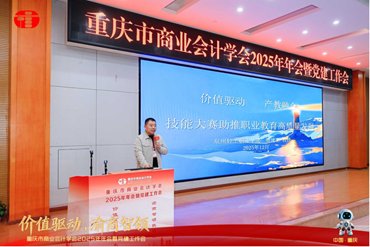 12 月 27 日,重庆市商业会计学会 2025 年年会暨党建工作会在重庆商务职业学院成功召开。本次会议以“价值驱动新未来,渝商智领数据浪潮”为主题,汇聚来自成渝双城经济圈的高校、行业企业的280余位领导、专家及会员代表齐聚一堂,共同探讨在数字经济与新质生产力蓬勃发展的时代背景下,财会行业如何通过智能化转型驱动价值创造,服务区域经济高质量发展。学校副校长李焱、会计金融学院党总支书记、院长冉启江出席了本次学术年会,开幕式由会计金融学院副院长邓亚昊主持。