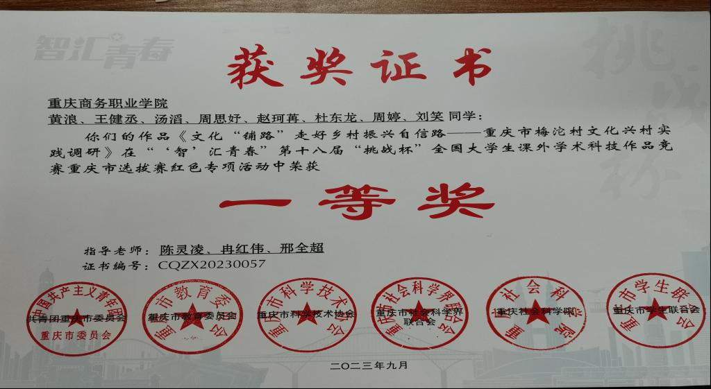 由黄浪、王健丞、汤滔、周思妤、赵珂苒、杜东龙、周婷、刘笑选送的作品《文化“铺路”走好乡村振兴自信路——重庆市梅沱村文化兴村实践调研》荣获“三下乡”红色专项一等奖,他们的作品致力于文化振兴,为乡村发展提供文化发展模式建议。
