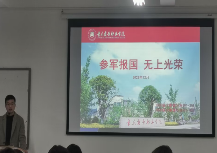 【文/图 梅婧】“一人参军,全家光荣”、“国防连着你我他,安宁维系千万家”。为确保圆满完成2024年春季征兵任务,扩大征兵宣传的影响力和辐射面,提高大学生应征入伍的热情,2023年12月会计学院组织开展了“征兵入伍”主题班会。