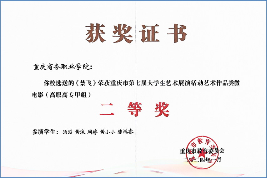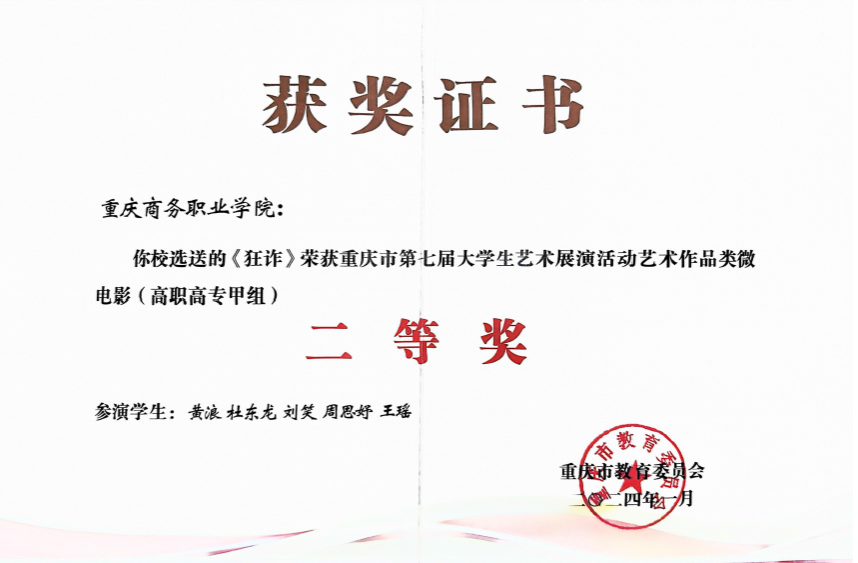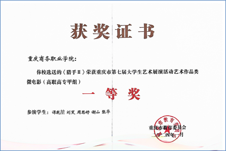 重庆市大学生艺术展演活动每三年举办一届,是我市目前规格最高、规模最大、影响最广的大学生艺术赛事。本届艺术展演活动以艺术作品、艺术表演、艺术实践工作坊、微电影及高校美育改革创新优秀案例五个大类为主要艺术形式。自2023年9月启动以来,我院积极响应和打造精品,选送了《猎手》《猎手2》《狂诈》《禁飞》四部作品参加微电影项目角逐。经过评委严格评审,最终猎手系列两部作品荣获一等奖,《狂诈》和《禁飞》获得二等奖。