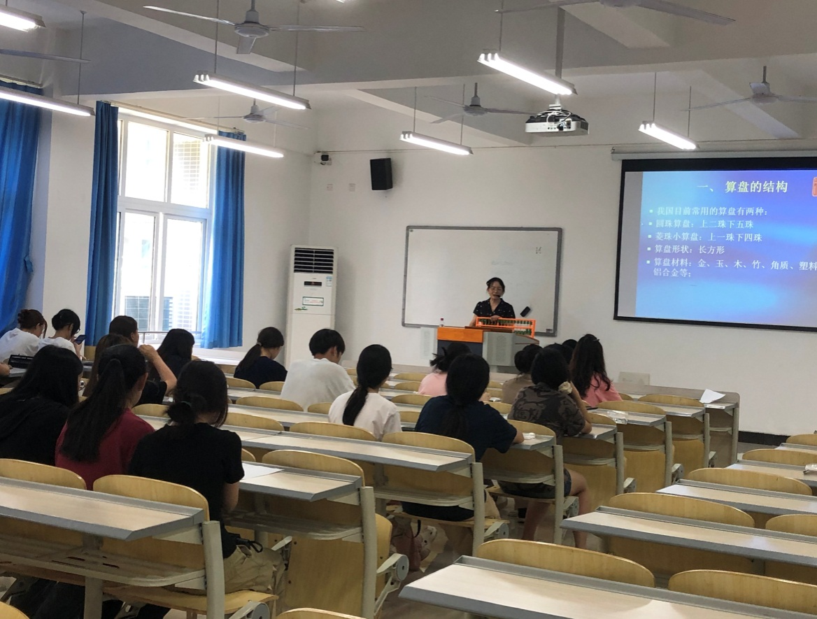 任老师从珠算的起源、用途、普及、文化传承等方面展开。介绍了算盘的结构,重点讲解珠算指法(单指拨珠,双指拨珠)、珠算加法(凑数、补数)、三盘清、七盘清等趣味加法。激发了学生对珠算的兴趣,现场掌声不断。学生纷纷表示,要学好专业技能,培塑专业品质。