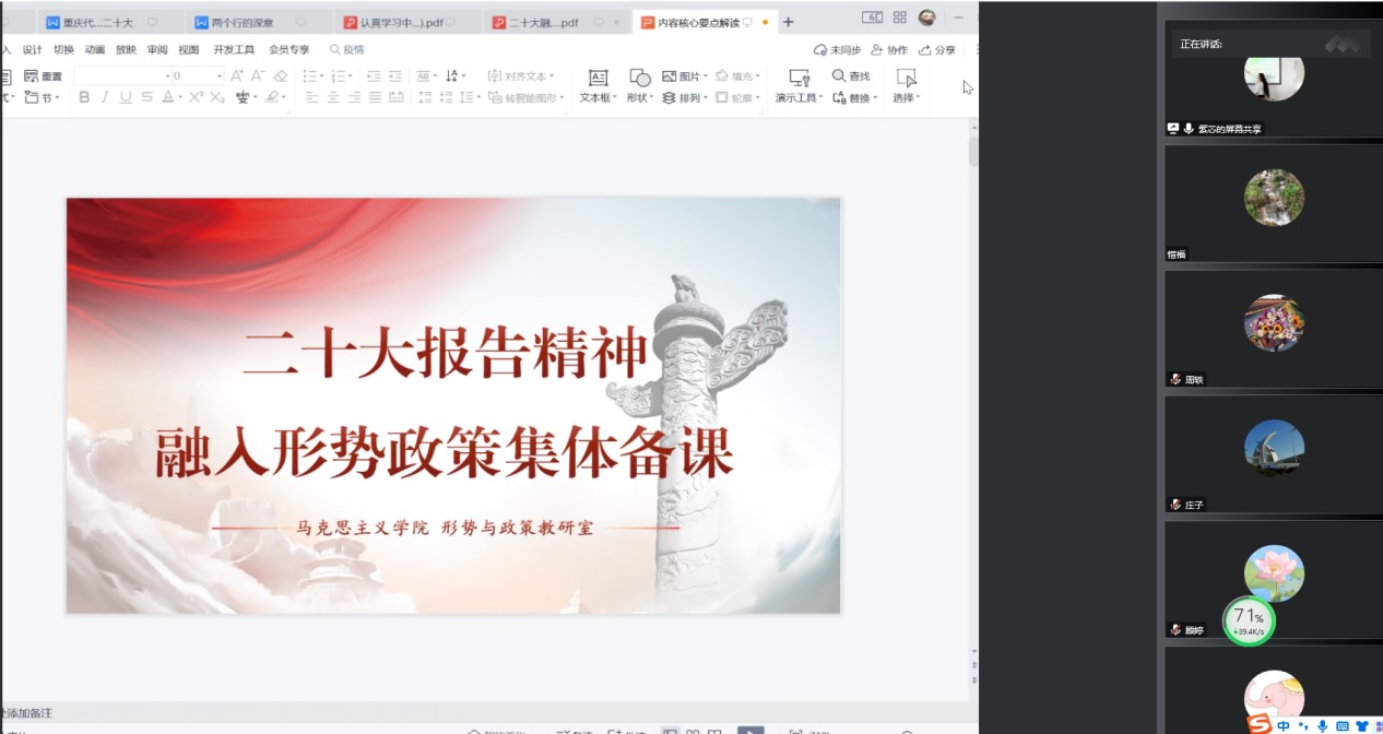 【文/图 向丽霞】2022年10月19日下午,马克思主义学院形势与政策教研室开展了“党的二十大精神”进课堂集体备课研讨会。10月16日,中国共产党第二十次全国代表大会在北京人民大会堂开幕,中共中央总书记习近平代表第十九届中央委员会向大会作报告,马克思主义学院全体教师认真学习贯彻落实党的二十大精神。为更加扎实地把党中央的各项决策部署落实到教学一线,马克思主义学院形势与政策课教研室召开了本次集体备课会议。本次会议由刘燕老师主持,会议形式:腾讯会议。
