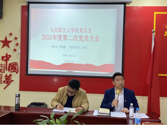 【图/顾志飞 文/钟小飞】3月31日下午,我党总支在1401召开了2021年第二次党员大会,会议由马克思主义学院党总支书记、院长邓龙建主持,学院全体党员教师参加了此次会议。