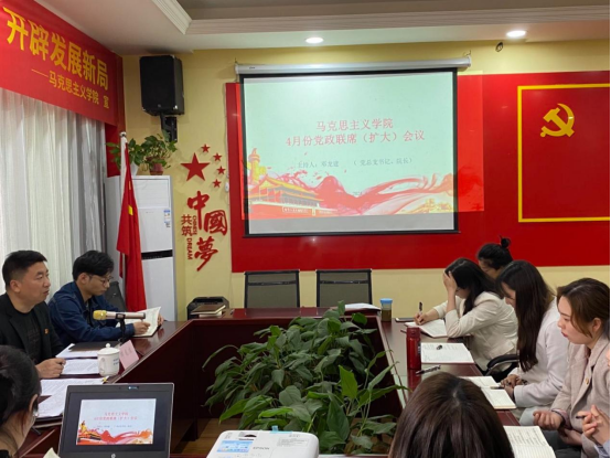 【图/ 顾志飞 文/伊龙 】4月21日下午,马克思主义学院召开4月份党政联席(扩大)会议,党总支书记、总支委员、办公室、各教研室主任和两个研究中心主任参会。会议由党总支书记、院长邓龙建主持。
