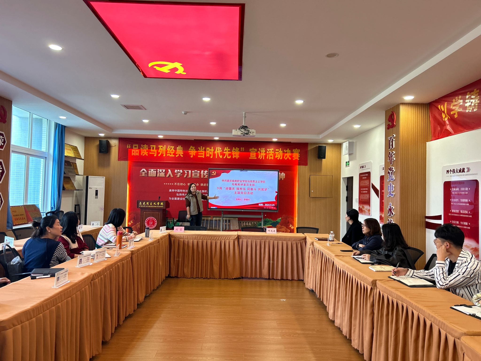【文/图 顾婷】为庆祝中华人民共和国成立75周年,深入学习贯彻党的二十届三中全会精神,2024年9月25日,马克思主义学院毛概教研室党支部全体党员同志在2213党建工作室开展“迎国庆 强担当 同奋斗 共筑梦”9月主题党日活动。活动由毛概教研室党支部书记李娅婷同志主持,全体支部党员教师参加。