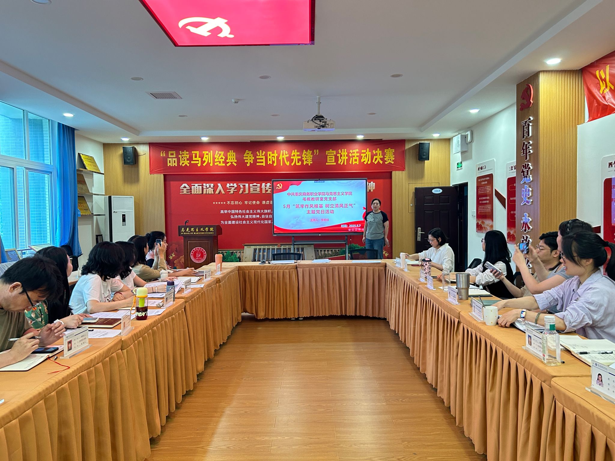 【文/图 顾婷】为持续推动深入贯彻中央八项规定精神学习教育走深走实,2025年5月7日,马克思主义学院毛概教研室党支部全体党员同志在2213党建工作室开展“筑牢作风根基 树立清风正气”5月主题党日活动。活动由毛概教研室党支部书记李娅婷同志主持,全体支部党员教师参加。