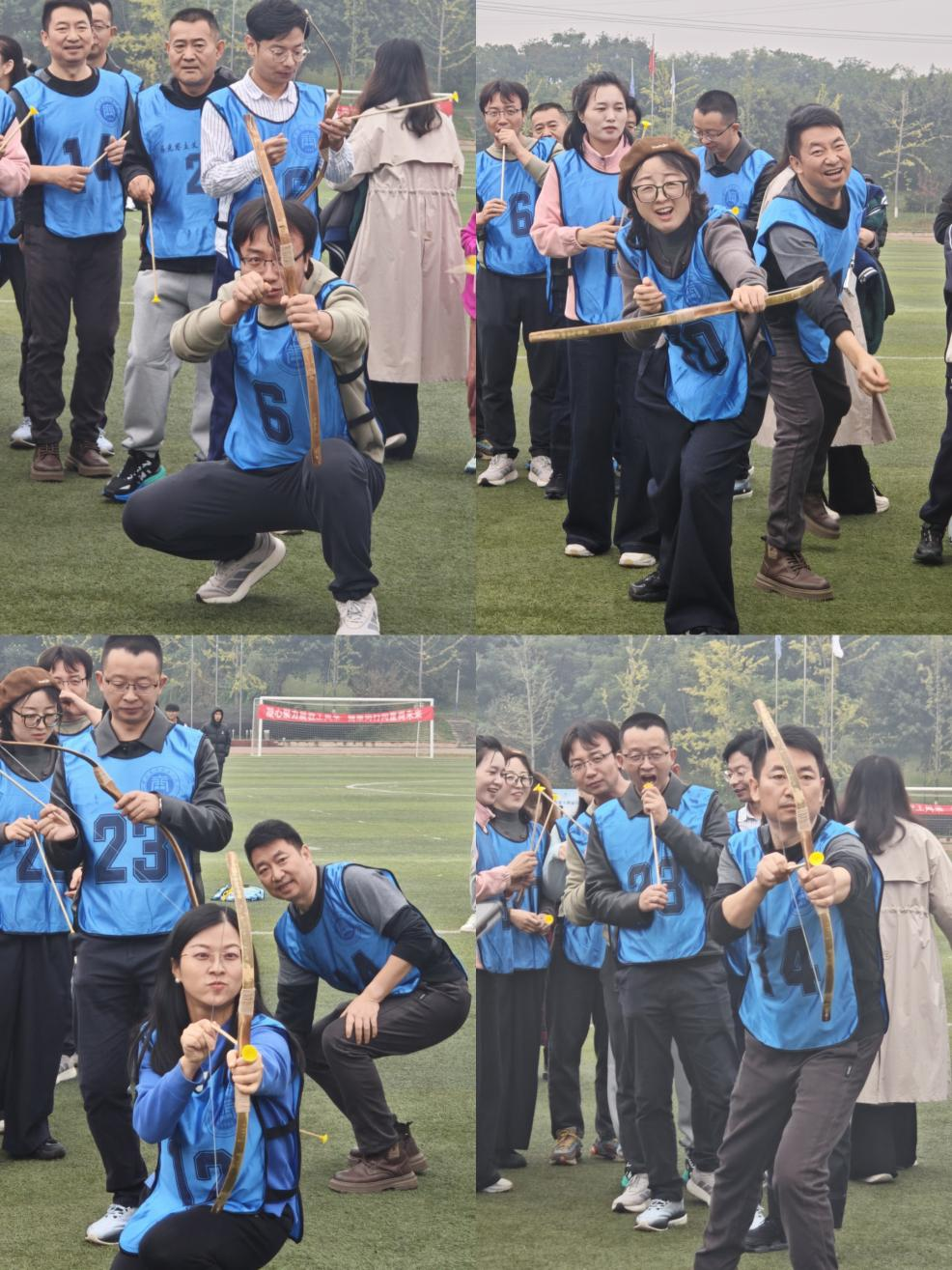 在趣味运动项目中,学院30名参赛队员组成的队伍更是活力满满,在“执弓引弦”“蒙眼敲锣”“袋鼠跳袋”三个项目中均有亮眼表现。“执弓引弦”环节,队员们凝神聚气、精准发力,在5分钟时限内默契接力,累计环数稳步攀升;“蒙眼敲锣”项目里,队员们在原地转三圈后,凭借队友的指引和自身的判断稳步前行,成功敲锣后快速折返完成接力,每一次击掌都传递着信任与力量;“袋鼠跳袋”赛道上,队员们套进跳袋双脚同步起跳,蹦跳前行、绕过标志、折返归来,动作连贯有序,充分展现了团队的协同作战能力。赛场边,学院观赛教师组成的啦啦队呐喊助威、掌声不断,加油声与欢笑声交织,营造了团结友爱、积极向上的浓厚氛围。