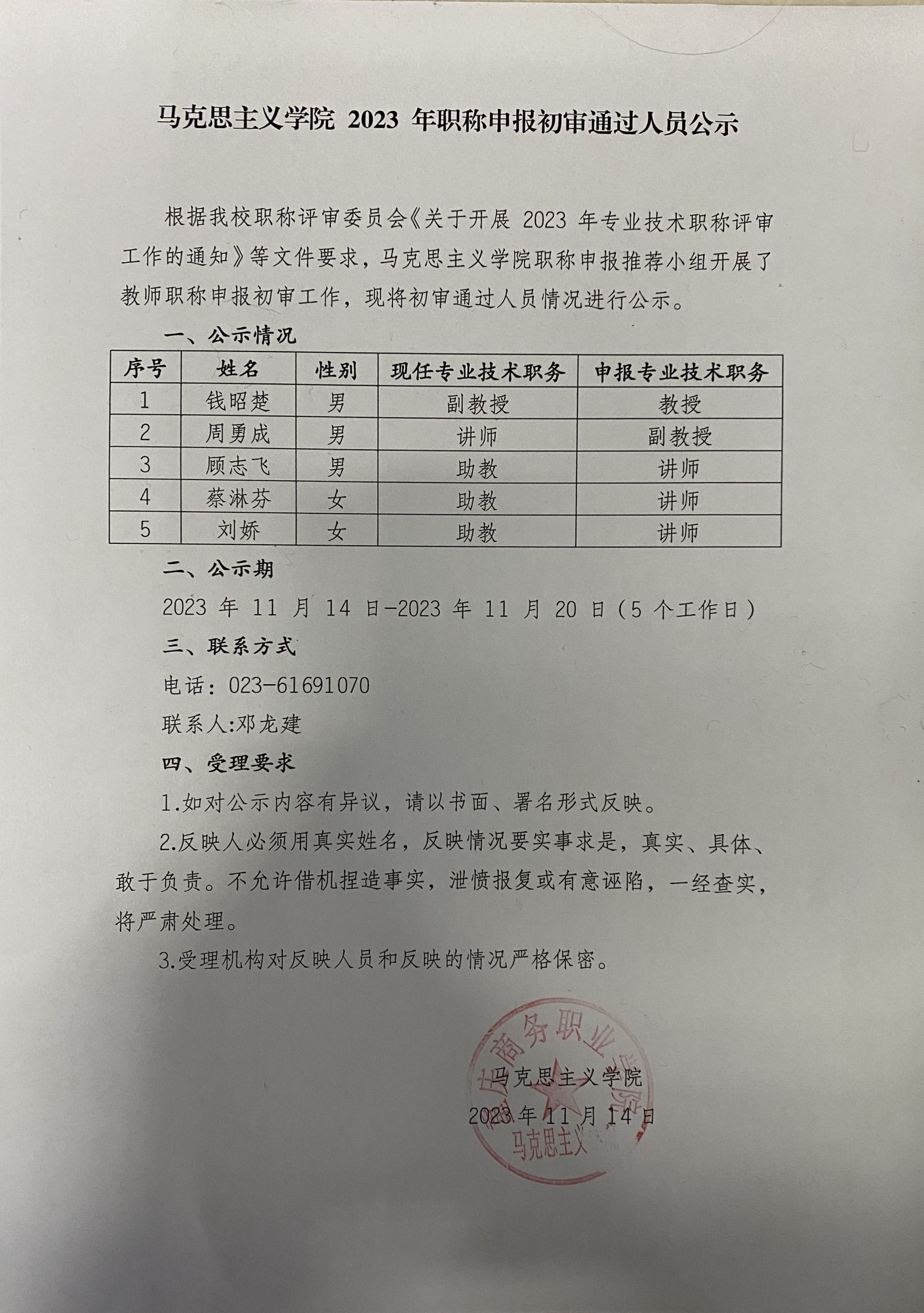 马克思主义学院2023年职称申报初审通过人员公示