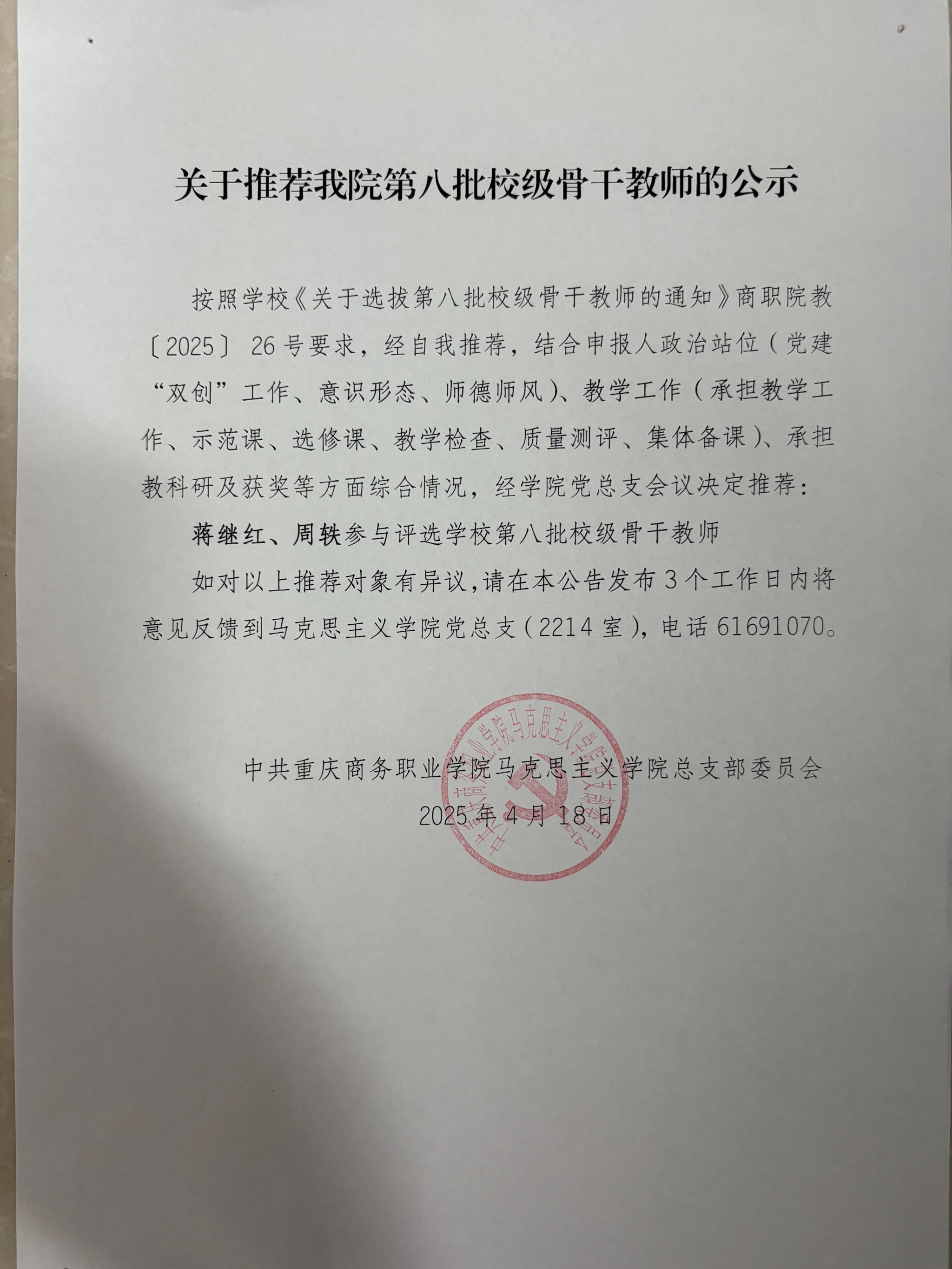 关于推荐我院第八批校级骨干教师的公示