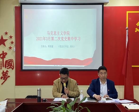 在学习准备阶段,邓龙建传达了学校党史学习教育领导小组办公室《关于2021年3月第二次党史集中学习的通知》,并对全体党员教师提出学习要求,明确了学习纪律。他号召大家要坚持正确方向,准确把握重点,从党的百年伟大奋斗历程中汲取继续前进的智慧和力量,并把学习的内容和精神有效融入思政课堂,提高思政课质量,以优异的教育教学成绩向建党100周年献礼!