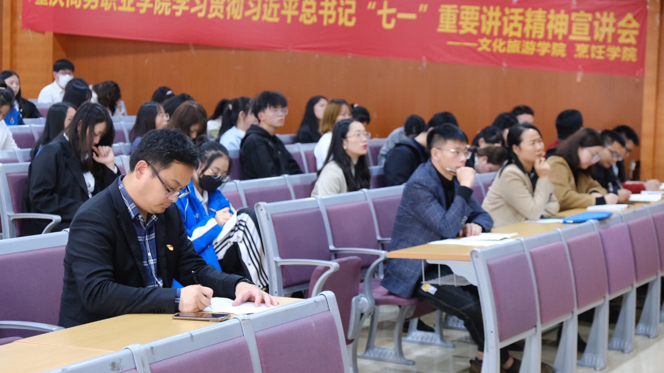 10月21日下午,学校宣讲队副队长、党委委员、副院长舒鸿在学生活动室就学习贯彻习近平总书记“七一”重要讲话精神作专题宣讲报告。烹饪学院、文化旅游学院党总支书记、院长、行政人员、党员师生代表100余人参加宣讲报告会。