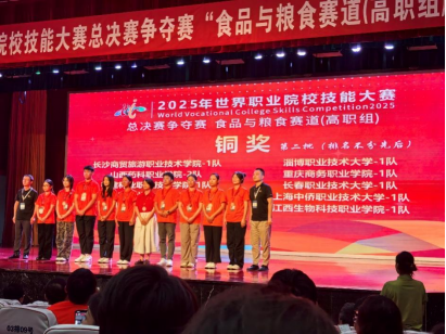 8月26日,2025年世界职业院校技能大赛总决赛争夺赛食品与粮食赛道(高职组)在芜湖落下帷幕。我校烹饪与食品学院代表队在任红、王丽老师的指导下,由梁富、蓝万萍、王健诚三位同学组成的参赛队伍经过激烈角逐,最终荣获大赛铜奖。