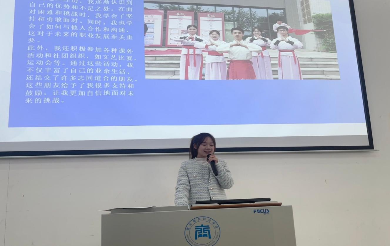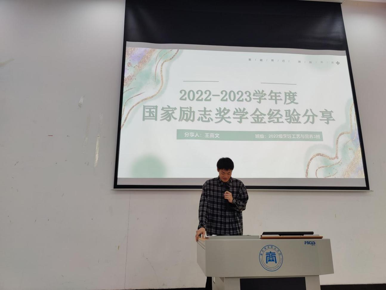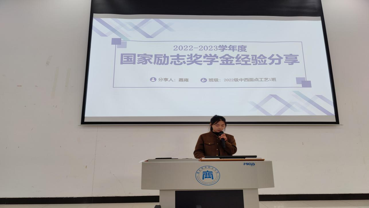 2021级食品检验检测技术1班李林桐作为国家奖学金获得者代表以《双向奔赴的追光者》为题从立德、立学、立能、立身四个方面分享了他丰富而充实的大学生活。2022级中西面点工艺1班聂雍、2022级食品检验检测技术2班谢婷两位同学作为国家励志奖学金获得者分别从团学骨干工作经历和志愿服务实践、学习技巧和学习经验等方面分享个人成长经验。
