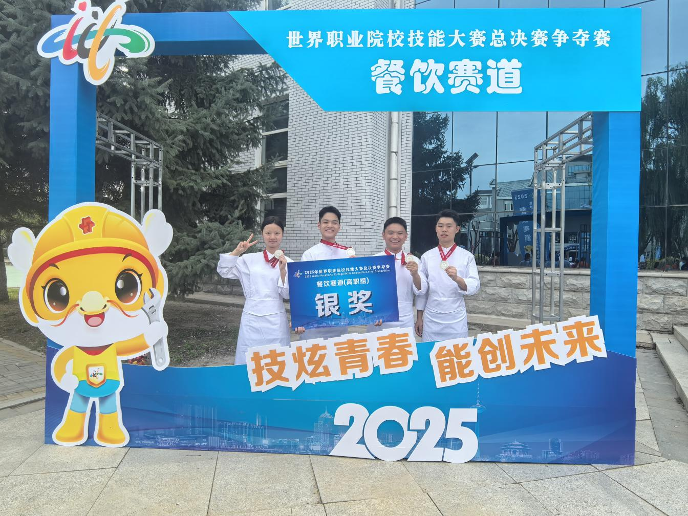本次大赛是教育部牵头组织的职业教育国际性高水平职业技能赛事。我校代表队由指导教师冯勇、周占富精心指导,选手李函(2023级西式烹饪工艺专业)、陈浏阳(2023级烹饪工艺与营养专业)、苏木牛(2024级烹饪工艺与营养专业)、秦佳浩(2024级烹饪工艺与营养专业)四位学生组成。团队以扎实的专业技能、创新的菜品设计和默契的团队协作,从全国众多高职院校中脱颖而出,最终以小组第二名成绩斩获“银奖”。