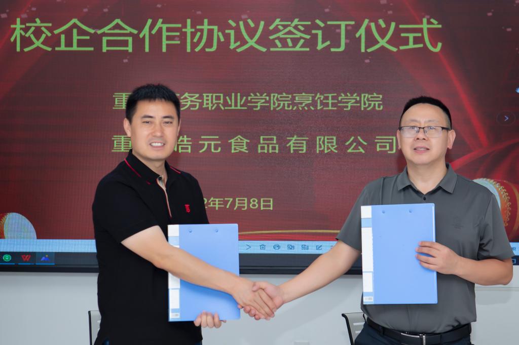 烹饪学院与重庆皓元食品有限公司签订校企合作框架协议,并授予重庆皓元食品有限公司“重庆商务职业学院烹饪学院实践育人基地”。