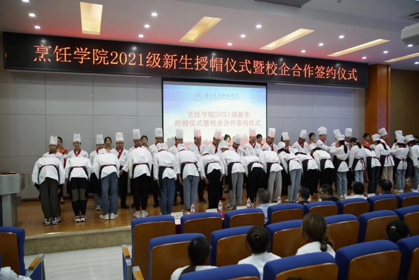 10月13日,烹饪学院在第二学术报告厅隆重举行了2021级新生授帽仪式暨校企合作签约仪式。副院长贾小波、重庆周师兄餐饮文化有限公司董事长周永林及其团队、烹饪学院党政领导班子,中国烹饪大师沈明辉等外聘教师代表和全体教师出席大会。