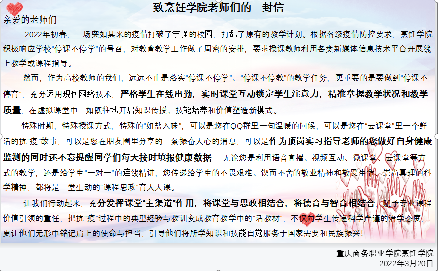 全员育人落实停课不停育”。学院发布《致烹饪学院教师的一封信》,号召全体教师在提升在线教学质量,发挥好课堂教学“主渠道”作用,上好线上“课程思政”育人大课。在校全体教职工每天深入学生宿舍,了解同学们在线学习状况,通过多项心理援助举措帮助同学们解决心理焦虑、困惑等问题,缓解心理压力,帮助学生们树立积极乐观的心态。