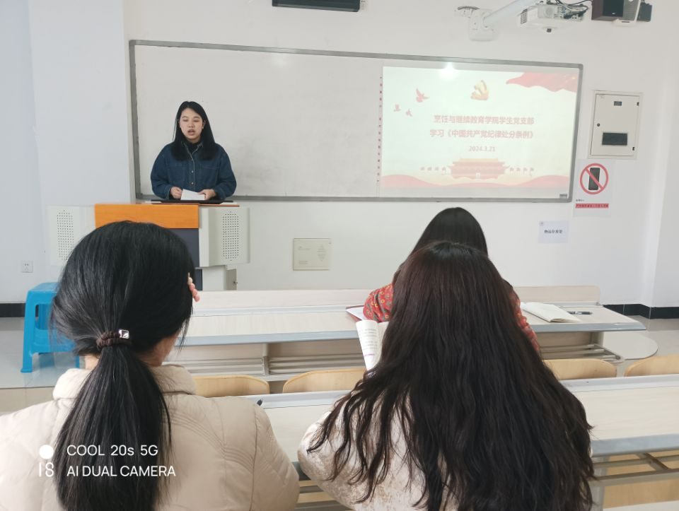 2024年3月21日,烹饪与继续教育学院学生党支部在2219教室通过线上线下结合的方式集中学习《中国共产党纪律处分条例》,会议由党支部书记邵玉华主持。
