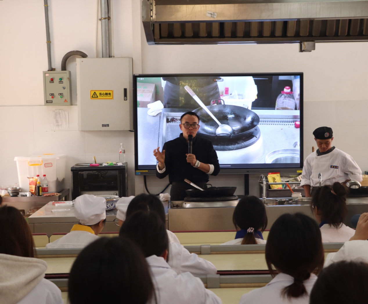 周朝勇大师在授课中为师生讲解了毛血旺的历史起源,并亲自示范制作。他还讲述了自己的从厨历程,分享了自己凭借对烹饪的热爱和刻苦钻研,从厨房小工成长为中国烹饪大师的成长过程和创业经历。同学们听后,很受触动,表示要向大师学习,立志成为烹饪行业翘楚。