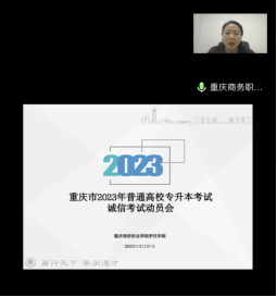 会议伊始,学院党支部副书记陈小容就学院近年来专升本录取情况和今年的相关工作做了介绍并宣讲了《普通高校专升本考试考试规则》、《国家教育考试违规处理办法》(33 号令)、《普通高校专升本考试考生必读》,要求学院全体专升本考生在会后签订《重庆市2023年普通高校专升本考试考生诚信承诺书》。