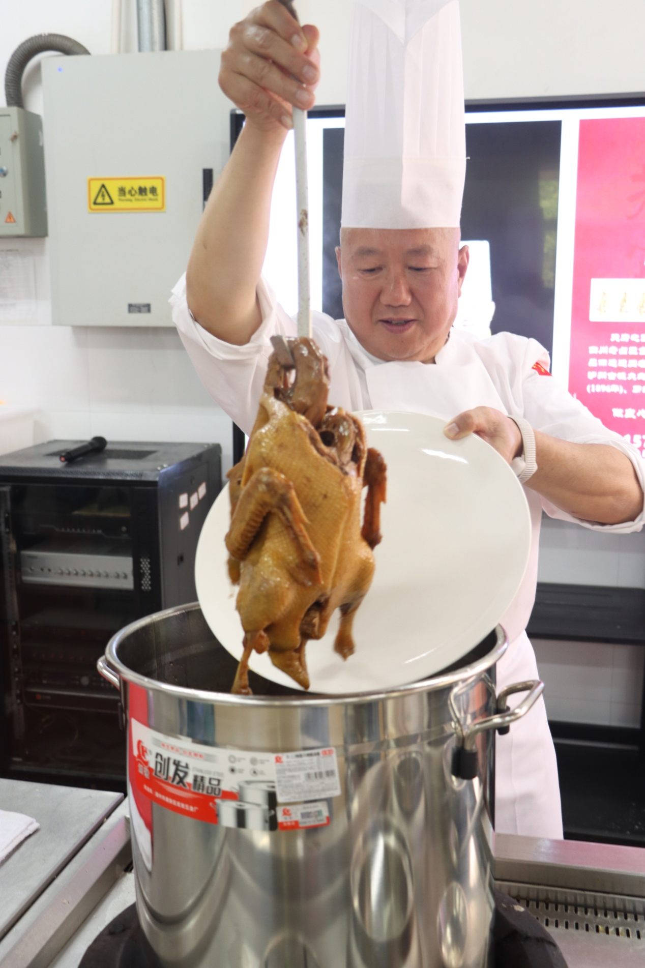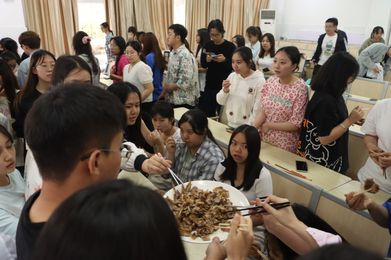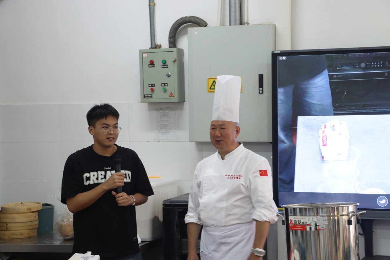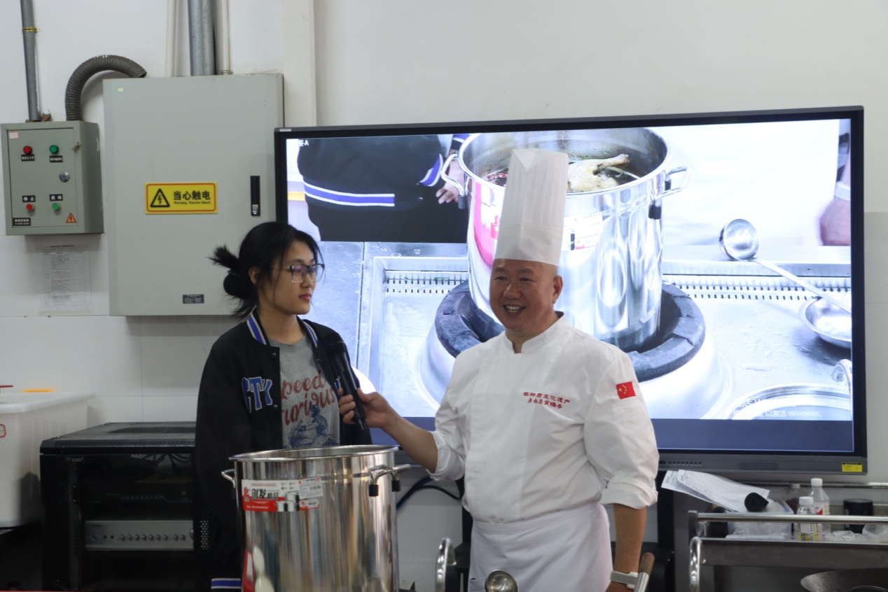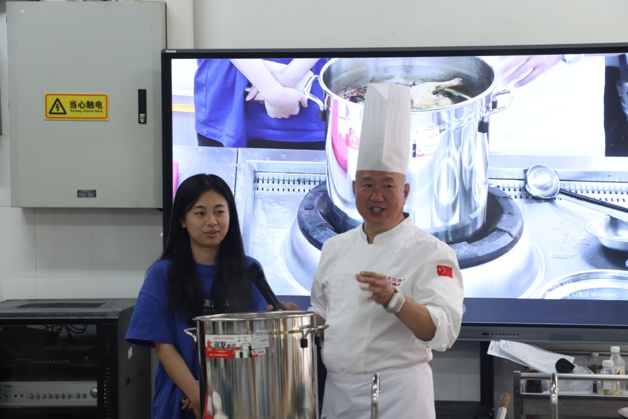 结合老卤匠肖鸭子非遗美食专题记录片,刘浬兵详细介绍了老卤匠肖鸭子的历史起源、传承谱系、发展现状等情况,现场展示了肖鸭子卤水调制技艺、鸭子加工技艺、卤制打签等流程技艺,同学们还积极地参与到制作互动中。