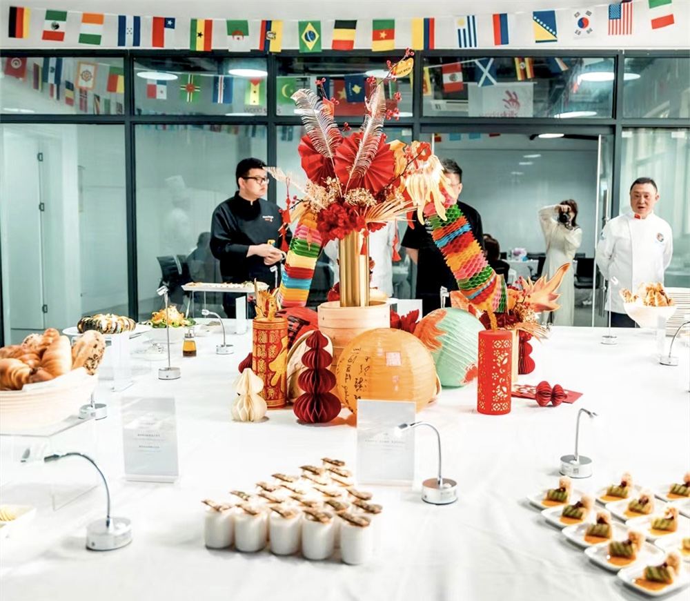 Alen Thong金咖啡壶青年厨师挑战赛是一项由世界厨师联合会组织并认证的代表国际高水平的烹饪技能竞赛项目之一。中国代表队依据赛事规则,确定了“龙年春节”的主题。展台设计中心盘踞着三条栩栩如生的龙,周围点缀红灯笼、红包、鞭炮等春节元素,营造出浓厚的节日氛围。在产品设计中,将中国的食材、中式味道以国际化的方式呈现在世界舞台,让外国朋友感受到中华美食的丰富多彩和独特魅力。朱锡双与其他五名队员默契协作,克服困难,经过48小时不眠不休的艰苦奋战,圆满完成24人享用的国际主题自助餐制作,选手们精湛的厨艺获得评委高度认可。