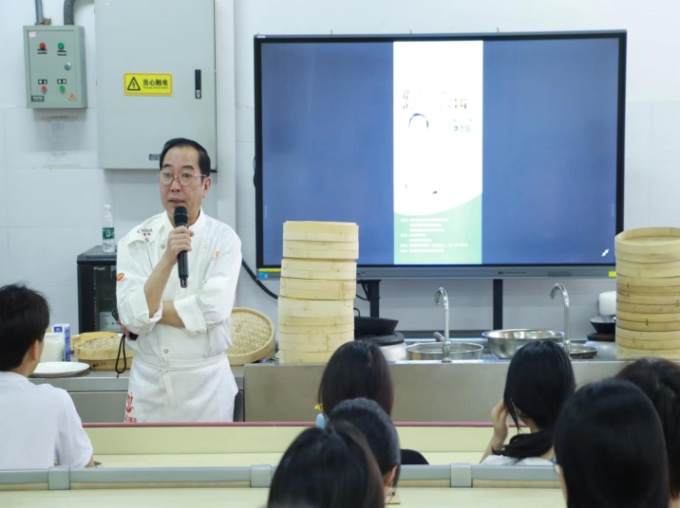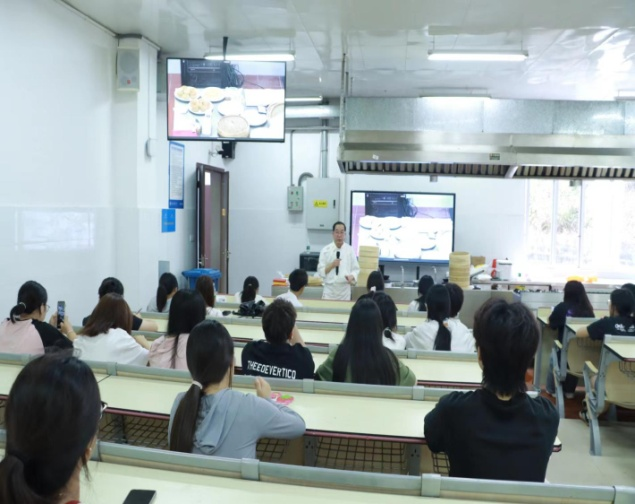 2024年9月18日下午,烹饪学院烹饪大师名师进校园“展绝活 传技艺”系列活动第9期在烹饪实训中心智能演播厅举行。为让烹饪专业师生深刻认识非遗美食——九园包子及月饼制作及其蕴含的饮食文化,特邀中式面点高级技师、重庆九园包子非遗技艺传承人龚志国先生为烹饪学院师生、美食研学社同学授课。