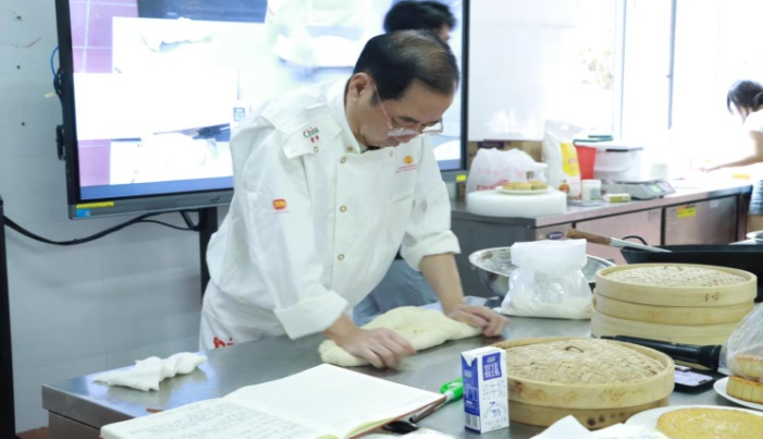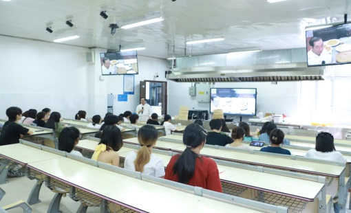 龚志国先生师从享有“白案泰斗”之誉的蔡雄大师,重庆“正东担担面”的第四代传人、国家特一级面点师。龚志国先生在授课中详细讲解了“非遗传承九园包子及月饼”的诞生、传承和发展,当前市场应用推广情况以及特殊的制作工艺。他向师生分享了自己从学徒开始,经拜师学艺成长为一名面点大师,直至事业有成的精彩人生。同时,向师生现场演示了九园包子的制作过程,讲述了九园酱肉包、月饼等极具代表性的面点制作的精髓。同学们听得非常入迷,部分同学学以致用,现场学了起来,龚志国先生耐心指导。